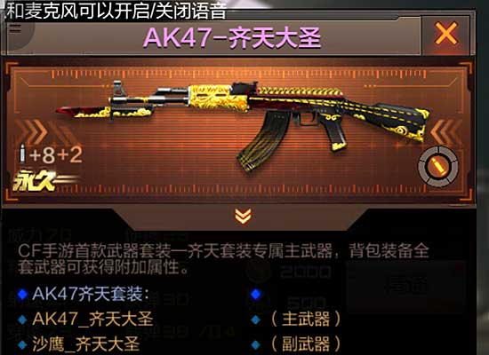 CF手游首款武器套装—齐天套装专属主武器,背包装备套装,主武器可获得附加属性。