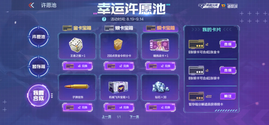 与以往的抽奖活动参与方式相同,购买指定抽奖钥匙,可进行许愿1次或者许愿10次的抽奖,每次抽奖随机获得奖池道具,道具分成期限和永久。值得注意的是此次抽奖的保底方式有所改变,从原来分解道具兑换成积分,变成了分解道具兑换成铜卡。不管是永久道具还是期限道具,都只能分解兑换成铜卡。然后用相应的铜卡合成银卡,银卡再合成金卡,才可以兑换相应的奖励。