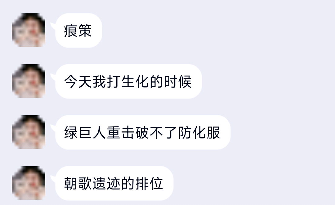 前段时间小编在摆烂的时候,突然收到一条来自某位不愿意透露姓名的恶霸的QQ消息,她怒气汹汹的找到我向我诉苦说自己打打朝歌遗迹生化的时候绿巨人重击破不了人类的防化服?